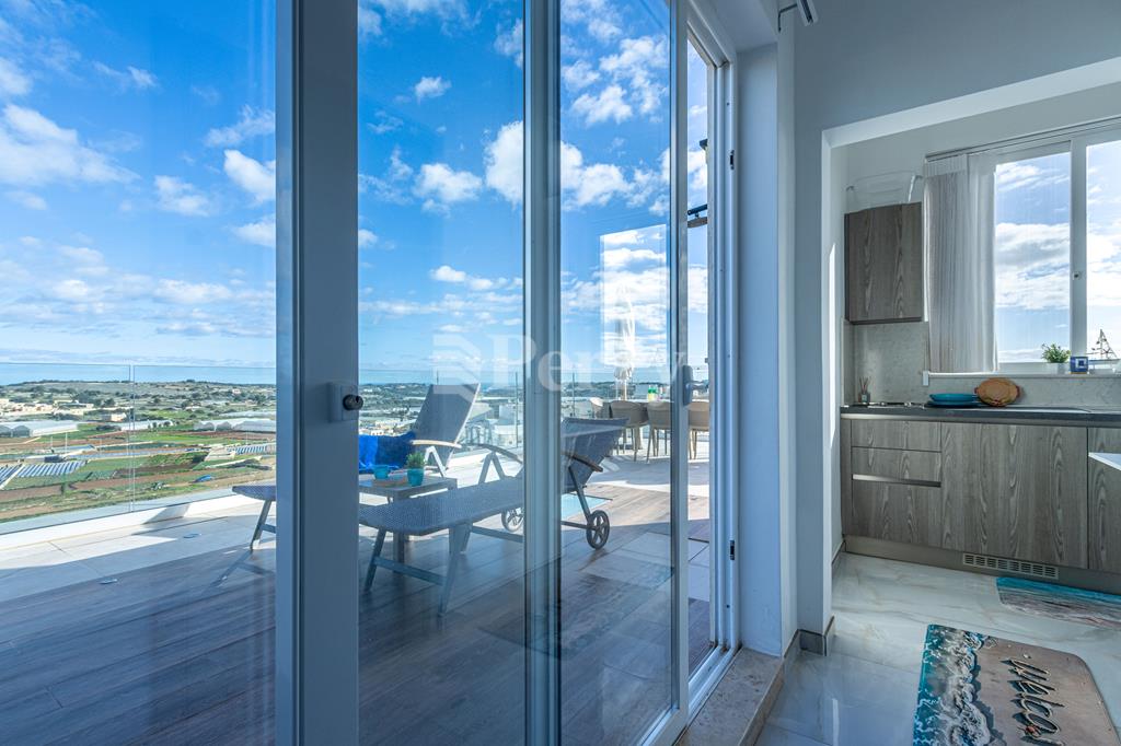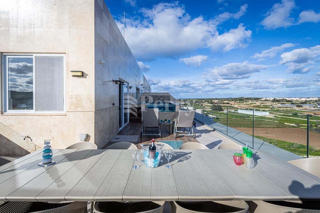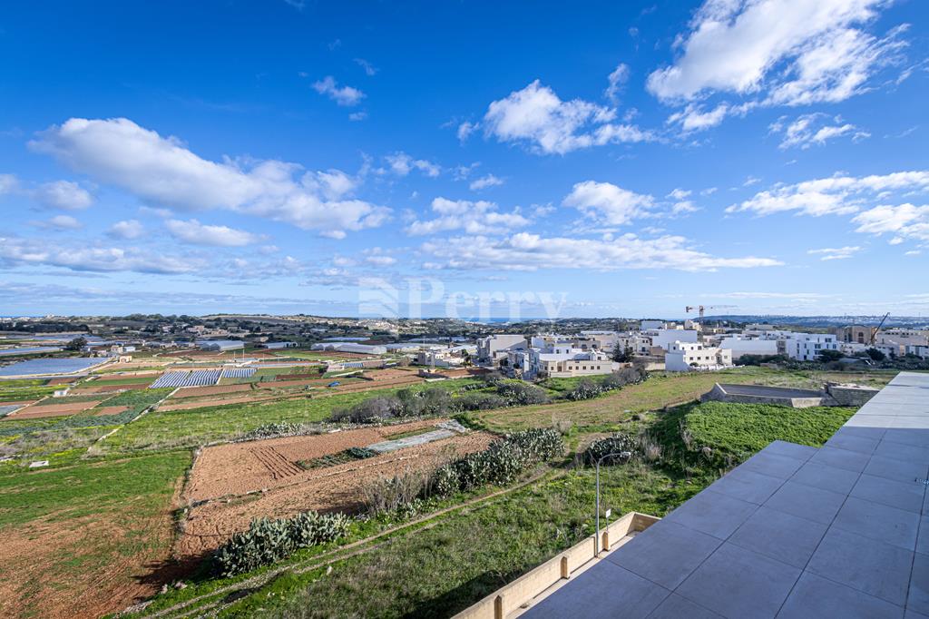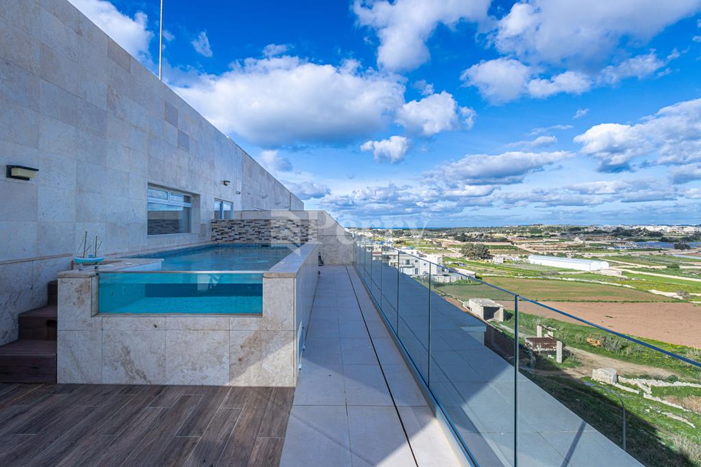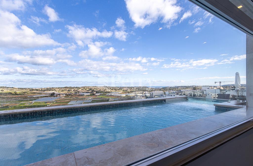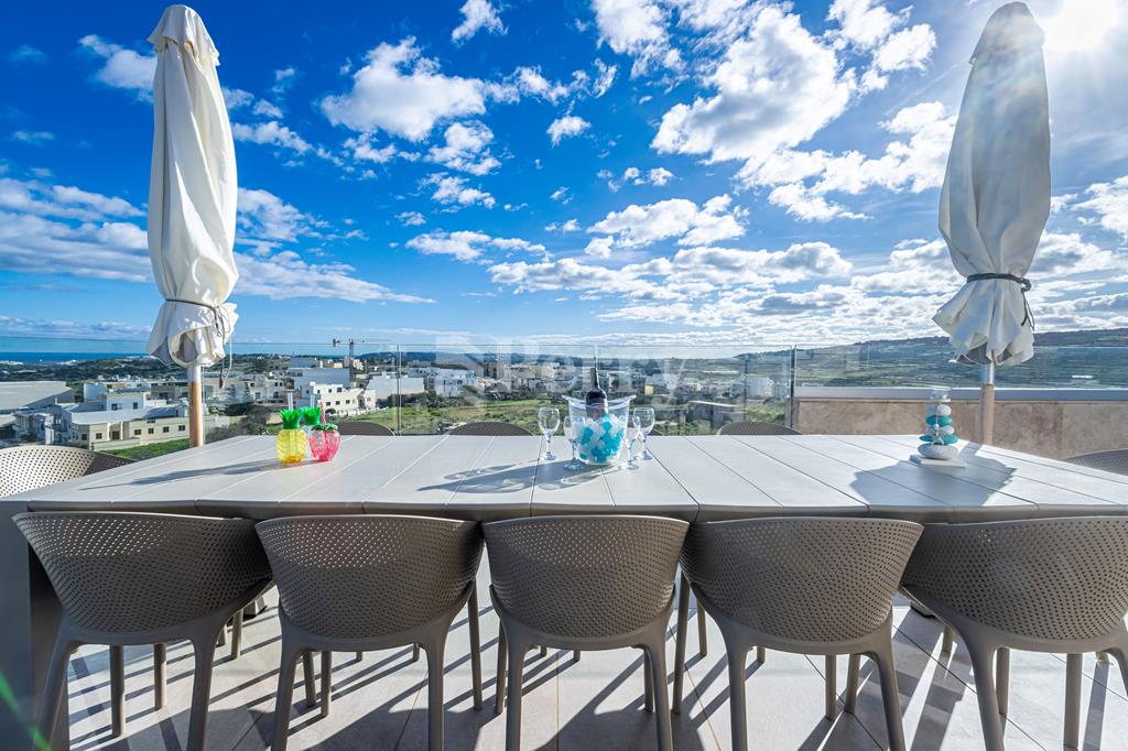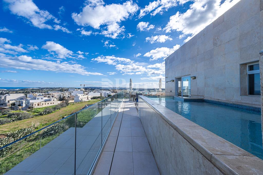 Set in a peaceful and highly desirable location, located within easy walking distance of the idyllic Gnejna Bay, this unique DUPLEX PENTHOUSE commands uninterrupted 360° views across open countryside and the sea. The property is exceptionally bright, generously proportioned, and being sold fully furnished for immediate enjoyment. The main level has a stylish open-plan kitchen, dining, and living space that extends onto a scenic terrace, ideal for hosting guests or simply soaking in the views. Three bedrooms are found on this level, including a master bedroom with en-suite facilities, together with a contemporary main bathroom. The upper floor, accessible both internally and via lift, enhances the home’s versatility, this level includes a washroom with a kitchenette, a comfortable secondary lounge with sofa bed, and an additional shower room, perfect for guests or independent living. The outdoor area is truly impressive, boasting an expansive terrace with a large 15,000-litre swimming pool, jacuzzi, and ample space for alfresco dining and relaxation, all framed by spectacular panoramic scenery. Additional features include five air-conditioning units, eleven solar panels, terrace CCTV, full ownership of airspace, in a lightning-protected, low-density block of just six units. An interconnecting four-car garage with storage is included in the price.
