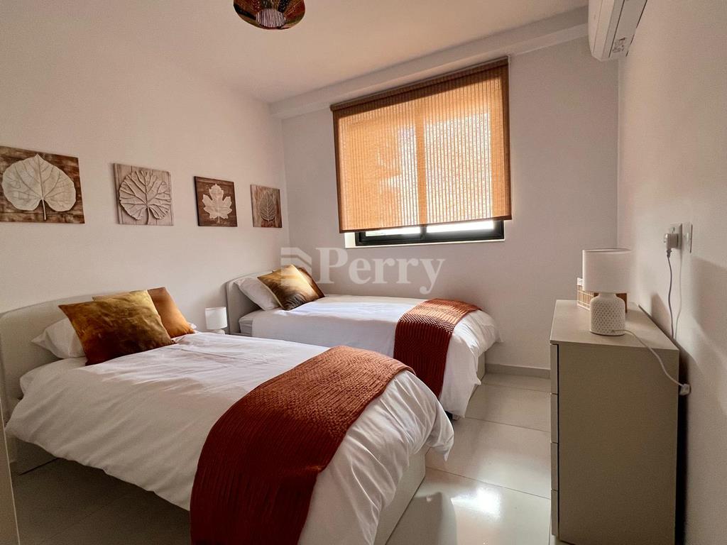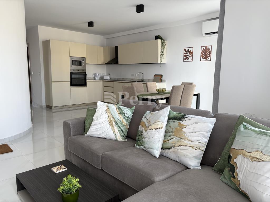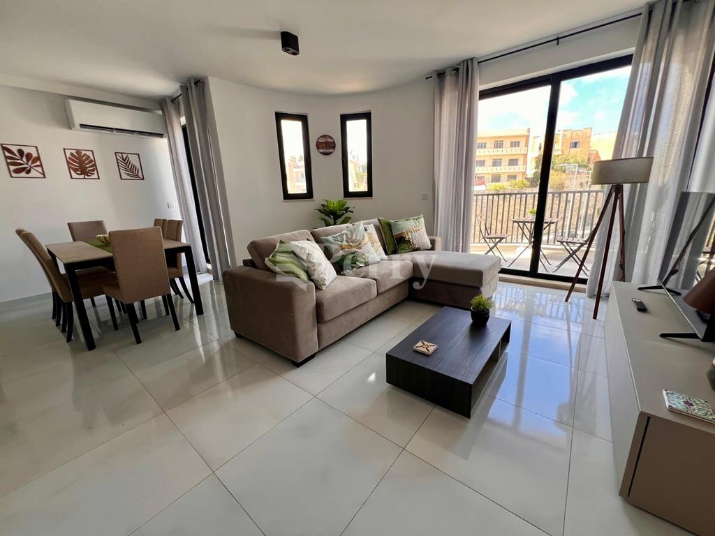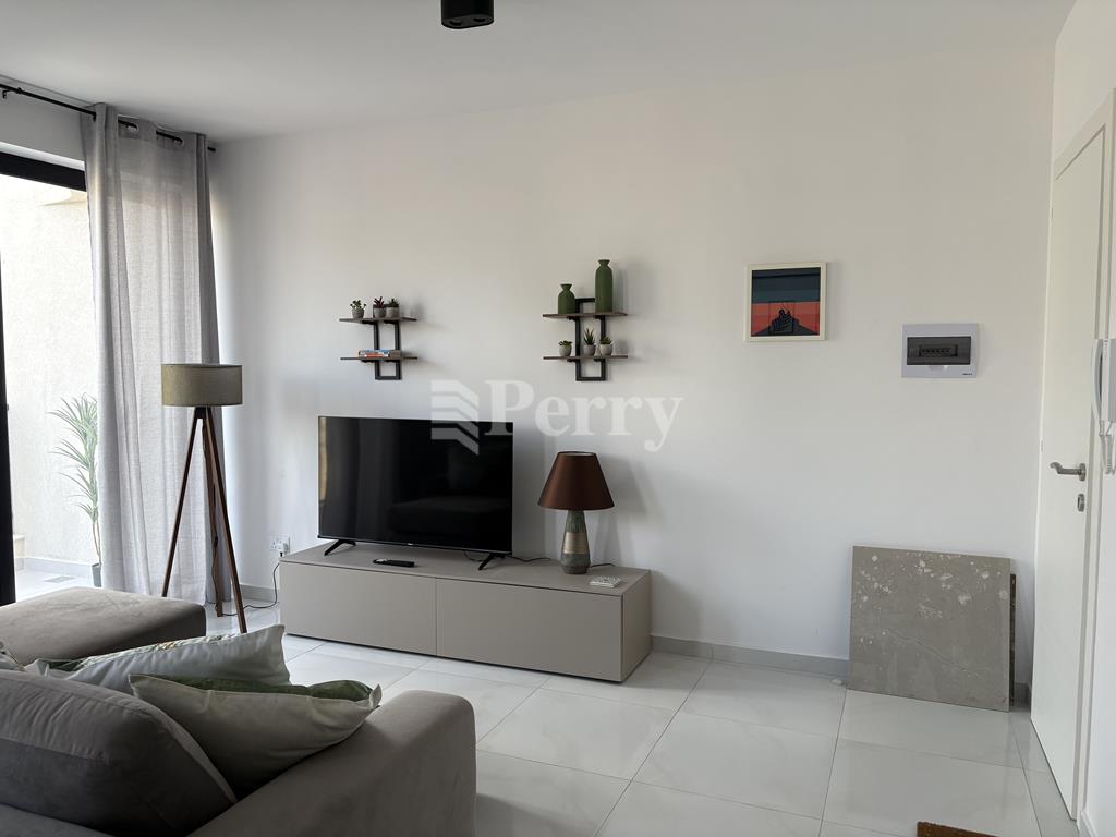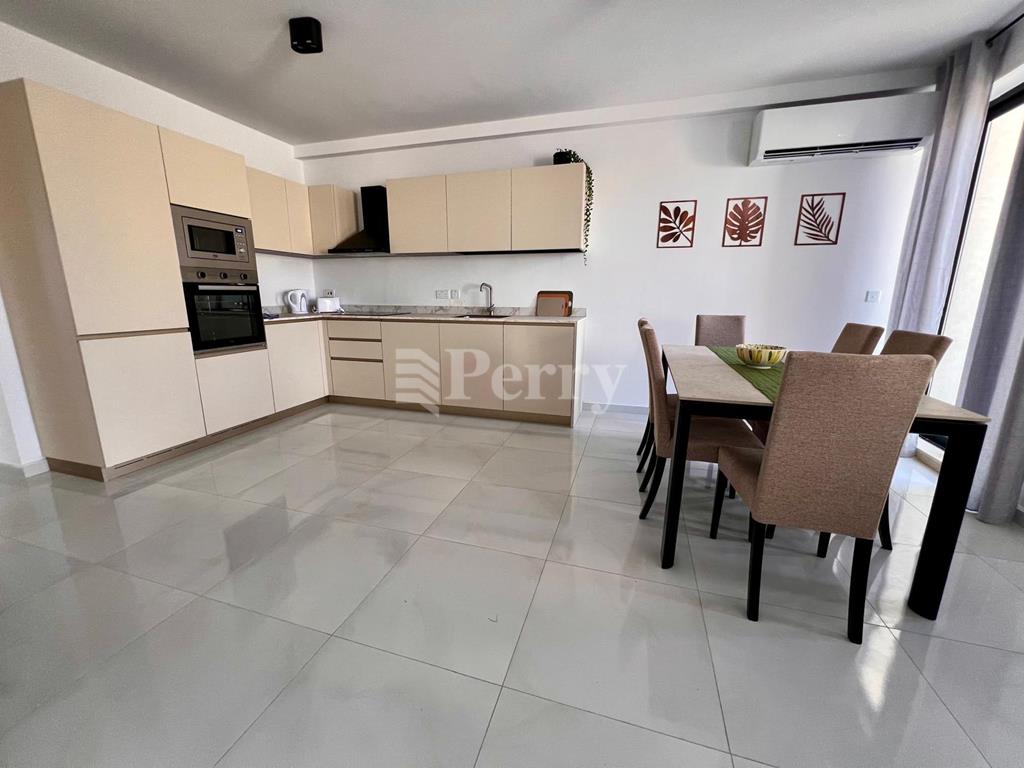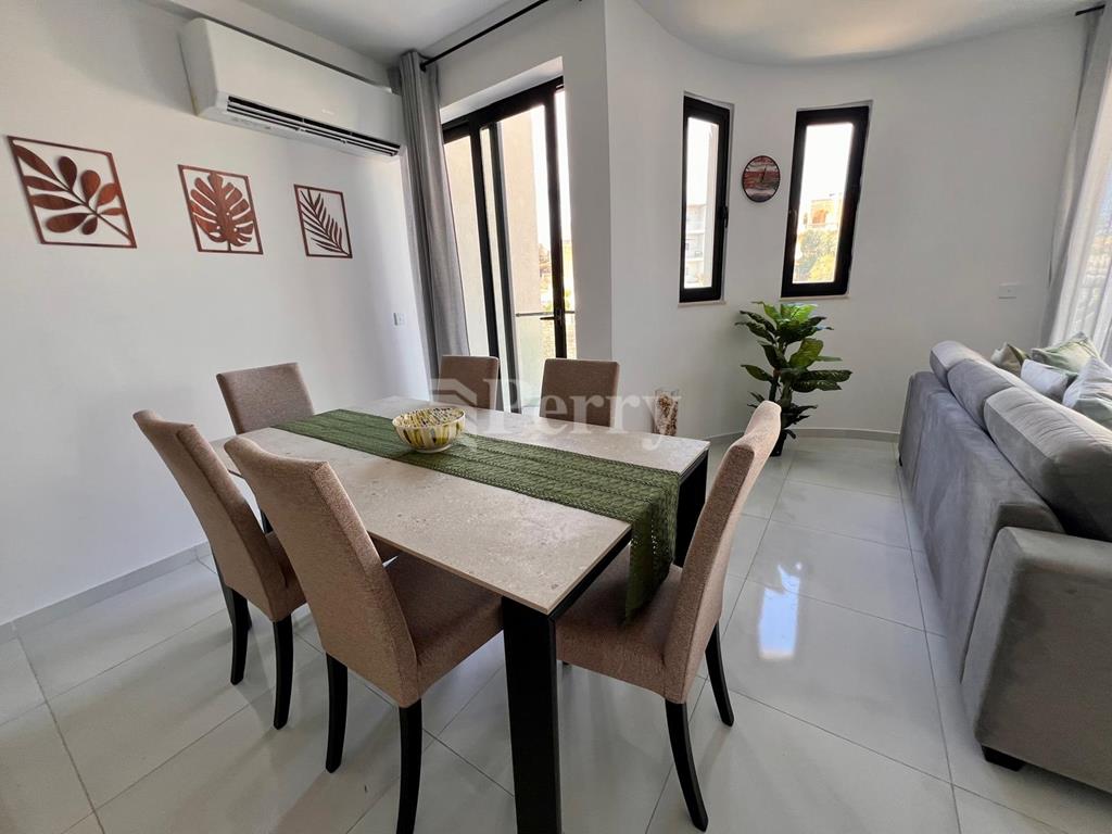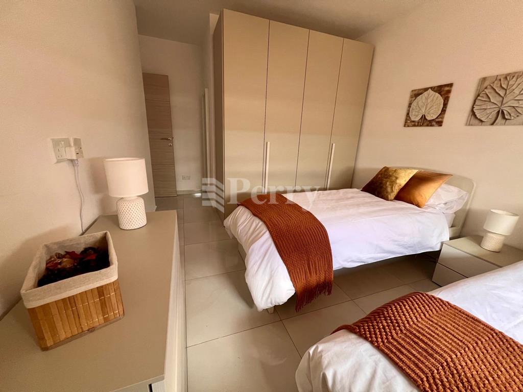 A bright and airy 2 bedroom Apartment, done up to great standards with top appliances, having an open plan kitchen leading onto two terraces, kitchen is fitted with ceramic hob, dishwasher, built in microwave and oven, 2 bedrooms 2 bathrooms, 1 ensuite, dedicated space for washing machine and dryer, utility cupboard. The back bedroom leads onto a quiet balcony with a table and chairs from which one can also enjoy distant views of Manoel island. Cleaning service is also included. Great for a small family.