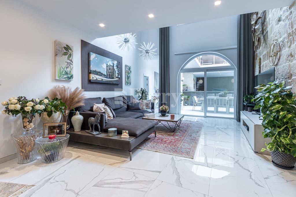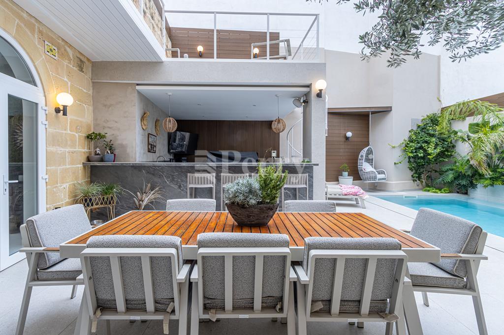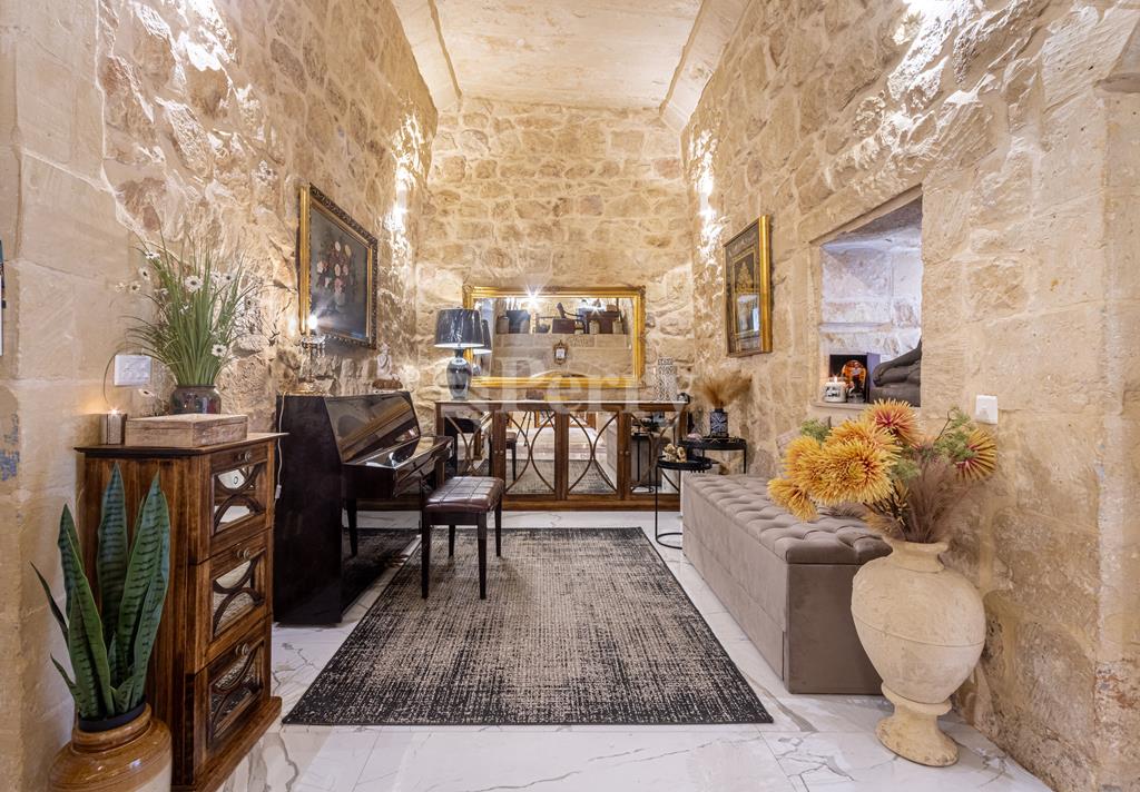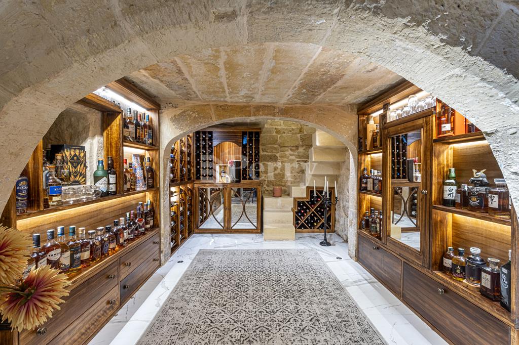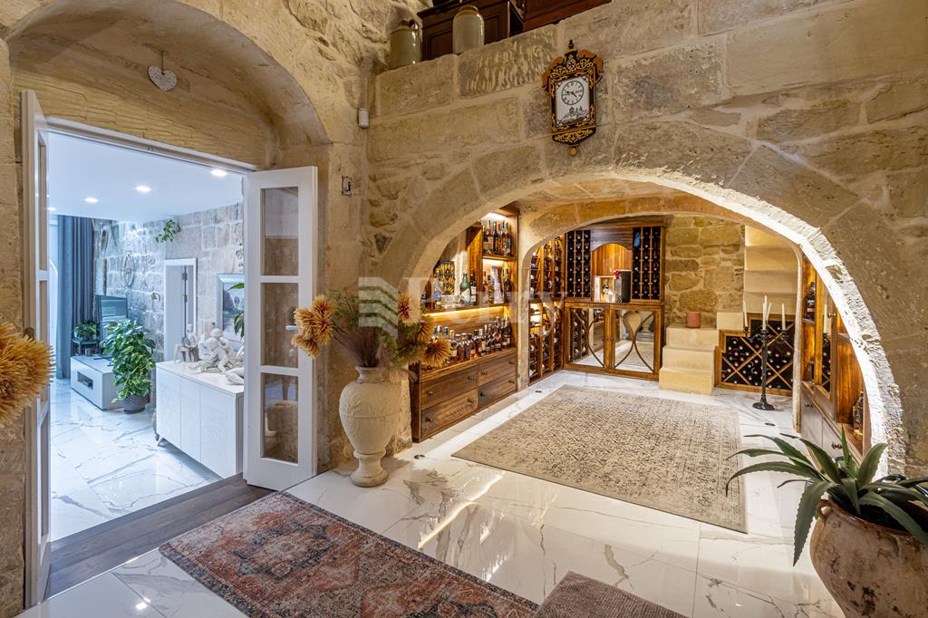 An exquisite House of Character, featuring a large outdoor pool and alfresco area, set within a quaint and tranquil village located in a UCA (Urban Conservation Area). The property boasts an abundance of authentic features, as it originally was a farmhouse, including original stone arches, animal stone troughs, high ceilings, and limestone walls, creating a wonderful harmony where historic charm meets a tastefully executed modern extension, completed with great attention to detail. This exceptional residence offers a rare opportunity to acquire a beautiful family home that provides seclusion, privacy, and character, tucked away in a picturesque alley within one of the island’s most charming villages. Accommodation comprises a welcoming entrance hall, with a piano room on one side and a stunning arched-ceiling room currently used as a cigar and spirits lounge with a library area. The property further enjoys a spacious sitting room with cathedral-height ceilings, opening onto a generous outdoor entertaining space featuring a large heated swimming pool and an alfresco area with outdoor kitchen and dining facilities, ideal for those who love to entertain. Adjacent to the sitting room is a separate, fully fitted and equipped kitchen/dining room, complete with top-quality appliances. The property offers four bedrooms and five bathrooms, including a master suite with a walk-in wardrobe and an en-suite bathroom. Additional amenities include a soundproofed cinema room, a spacious laundry room, and an outdoor roof-level terrace. Further benefits include solar panels, solar water heater, underfloor heating in bathrooms, a functional wooden pallet fireplace and a one-car garage. This small and quaint village offers beautiful natural scenery, a rich historical and religious cultural heritage, fascinating legends, and a peaceful rural lifestyle. Qrendi stands as a timeless example of a village that has endured for centuries. Its captivating old village core—where this property is discreetly nestled within an alley—has remained largely unchanged despite modern development on the outskirts, and is home to some of Qrendi’s most interesting and treasured landmarks.