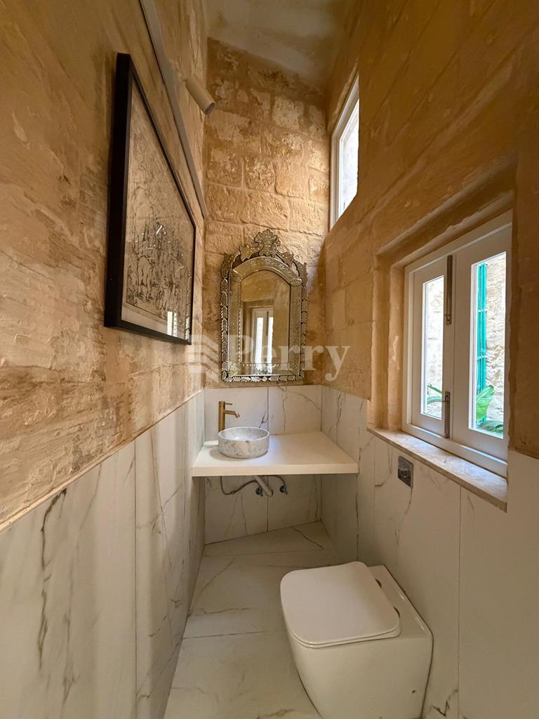 Zejtun – An exquisitely restored House of Character set within the heart of this sought-after traditional village, beautifully blending timeless elegance with contemporary comfort. Bathed in natural light and thoughtfully designed throughout, this exceptional residence offers refined living within an authentic Maltese setting. The property opens into an elegant sitting and dining area, ideal for both relaxed living and stylish entertaining. The newly fitted designer kitchen and breakfast room open directly onto the central courtyard, creating a sophisticated indoor-outdoor lifestyle and a tranquil space for al fresco dining. A discreet guest toilet completes the ground floor.The upper level hosts a luxurious master bedroom with a sleek, newly fitted bathroom, alongside a well-appointed second bedroom. A conveniently positioned utility room is located close to the roof level. At the basement level, two versatile rooms provide ample space for a private games room, wine cellar, gym, or additional storage, enhancing the home’s functionality while preserving its character. This rare property is rich in authentic features and architectural charm, offering an elegant yet comfortable lifestyle in a peaceful village environment. Being sold partially furnished, freehold, and ready for immediate occupancy.