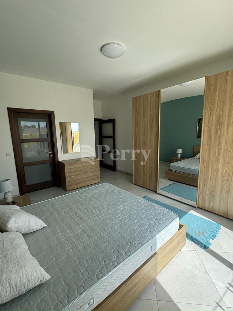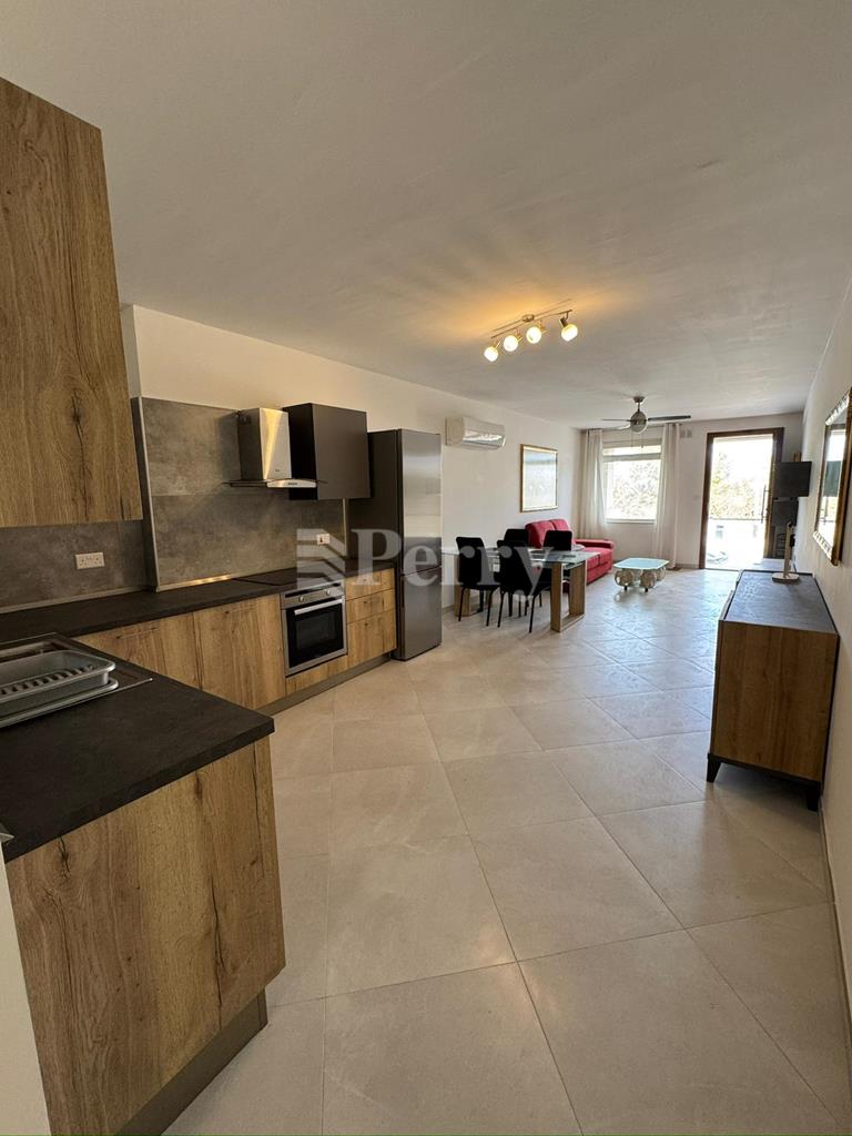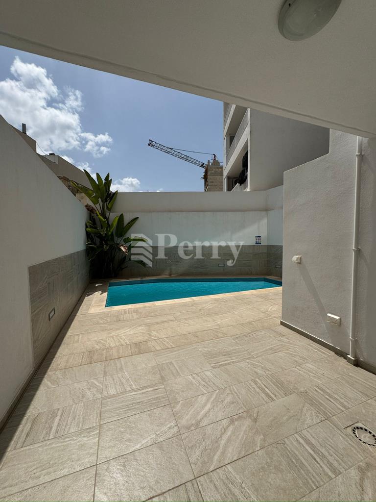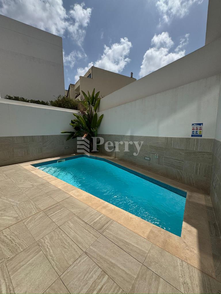 A modern 2-bedroom Maisonette in a great location opposite a green area, enjoying views of the Mosta valley.  This Maisonette is fully air-conditioned with an excellent designer finish.  It has an open plan massive kitchen/sitting/dining area, laundry room, two double bedrooms, a master bedroom with a shower room ensuite, a main bathroom, with a back terrace and a large private pool.
