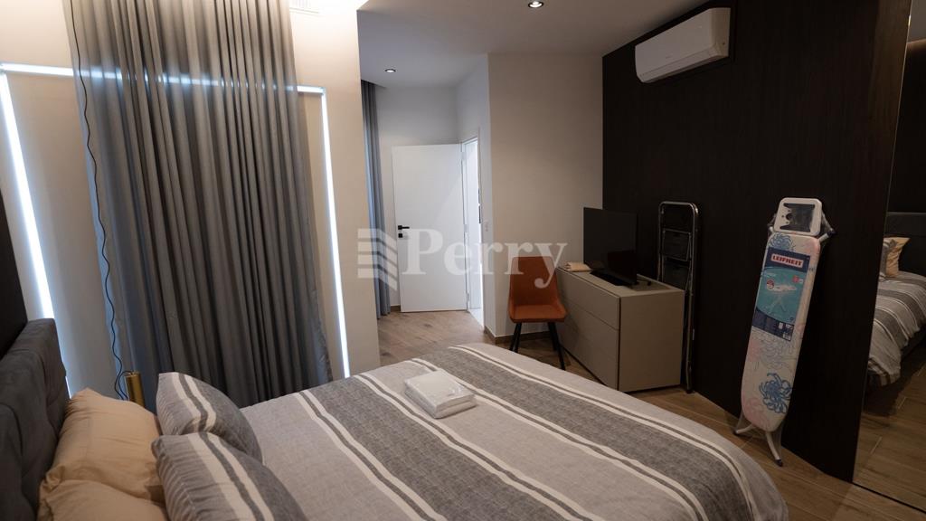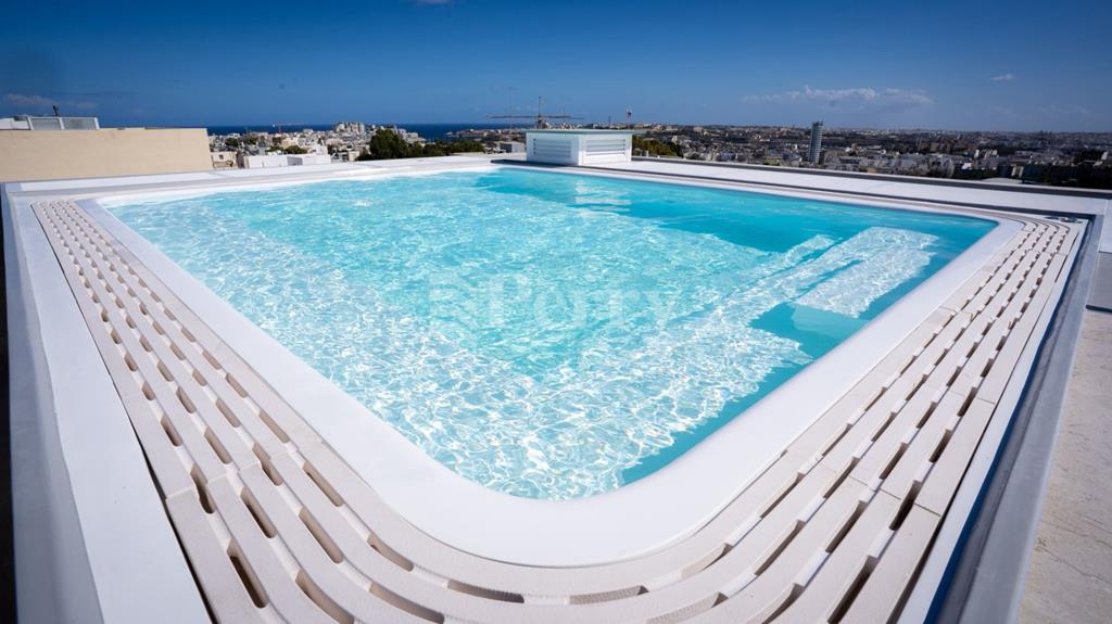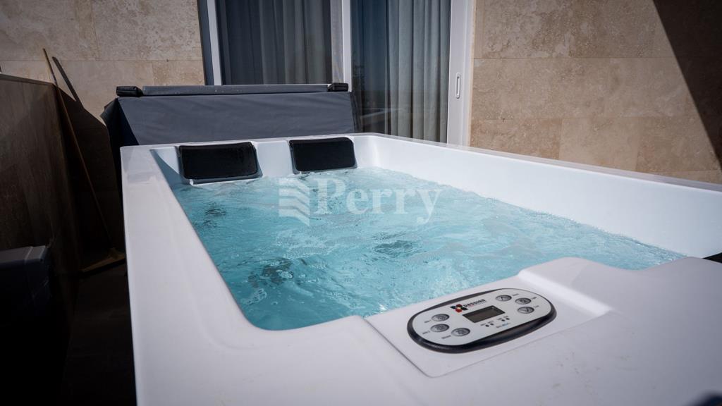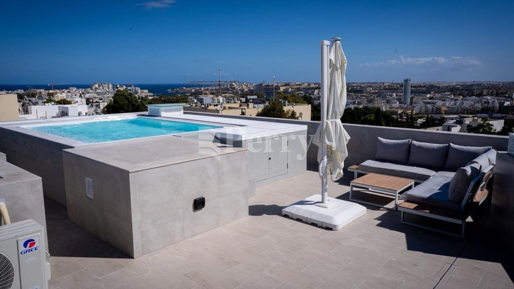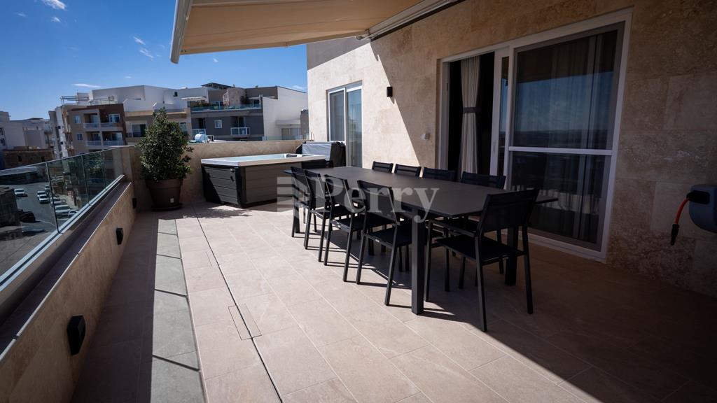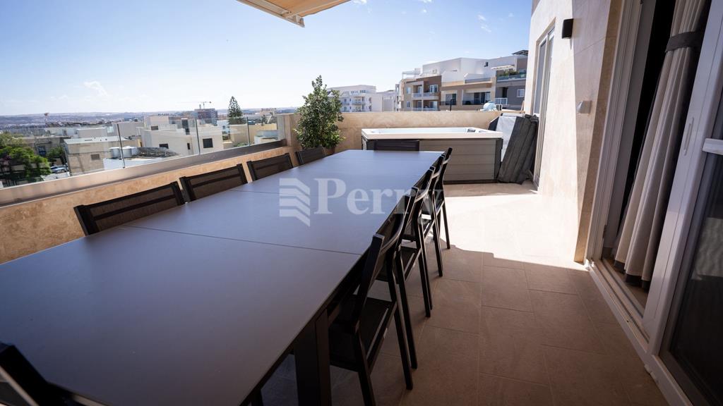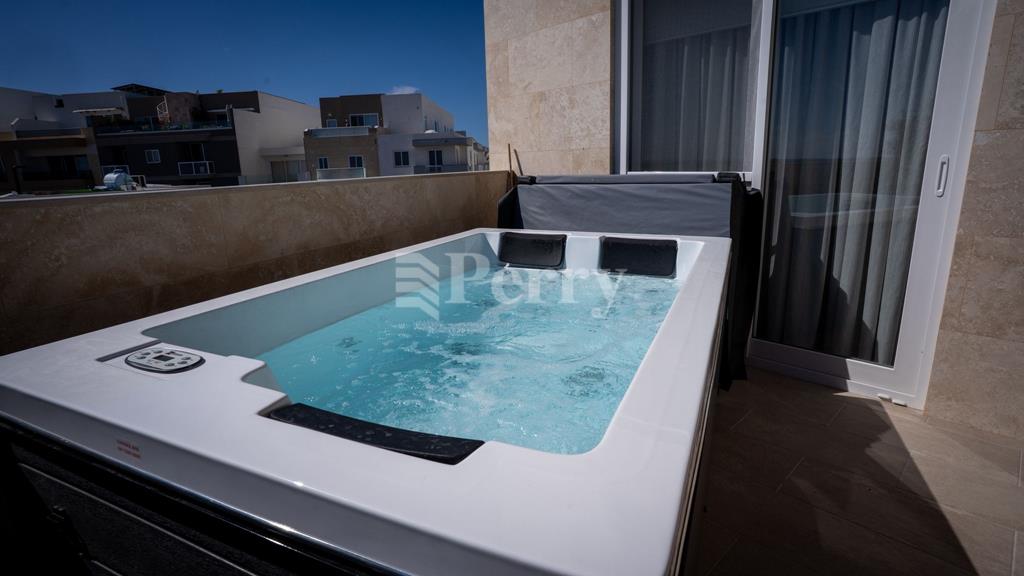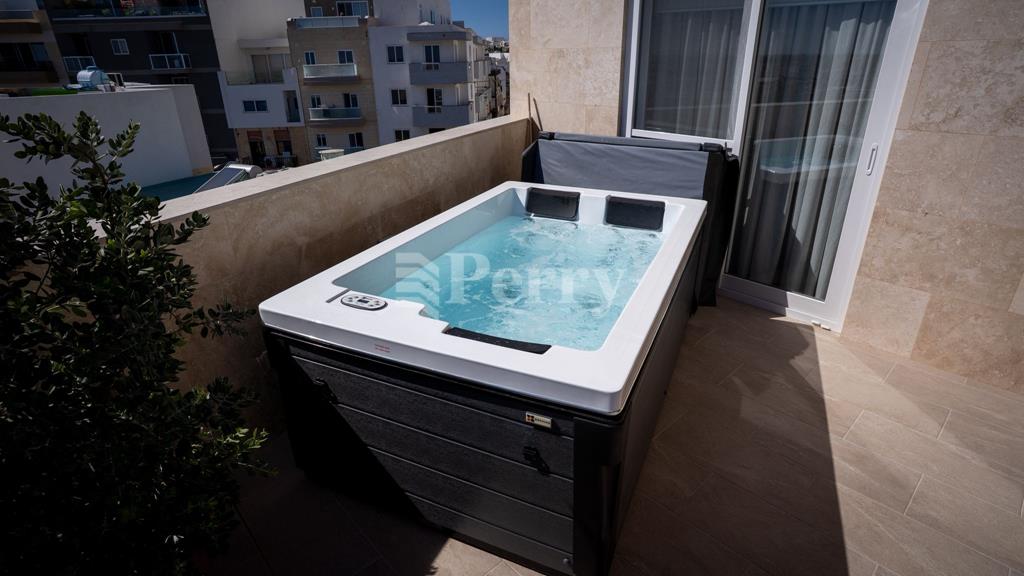 This modern and fully furnished two-bedroom, two-bathroom penthouse in the desirable residential area of Kappara offers a blend of comfort, style, and convenience. The open-plan layout connects the kitchen, dining, and living areas seamlessly, all finished to high standards and fully air-conditioned for year-round comfort. The master bedroom features an ensuite bathroom, while a main bathroom serves guests. A standout feature of this property is the private roof, perfect for relaxing or entertaining. It includes a five-seater outdoor sofa lounge, a four-seater private jacuzzi situated just off the bedroom terrace, and a fully equipped outdoor kitchen setup complete with a barbecue cupboard, outdoor fridge, and sink. This outdoor space offers the perfect setting for alfresco dining, entertaining guests, or simply unwinding in total privacy. The penthouse also comes with an interconnected, side-by-side two-car garage, and is served by lift access directly to the unit. Located in a quiet yet central part of Kappara, this property offers both tranquility and proximity to key amenities. Ideal for professionals, couples, or a small family looking for a stylish and well-equipped rental in one of Malta’s most convenient locations.