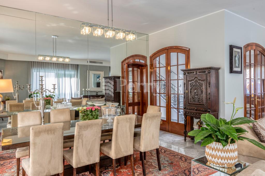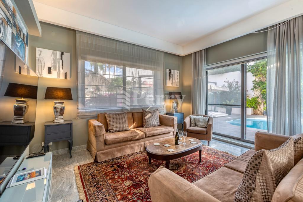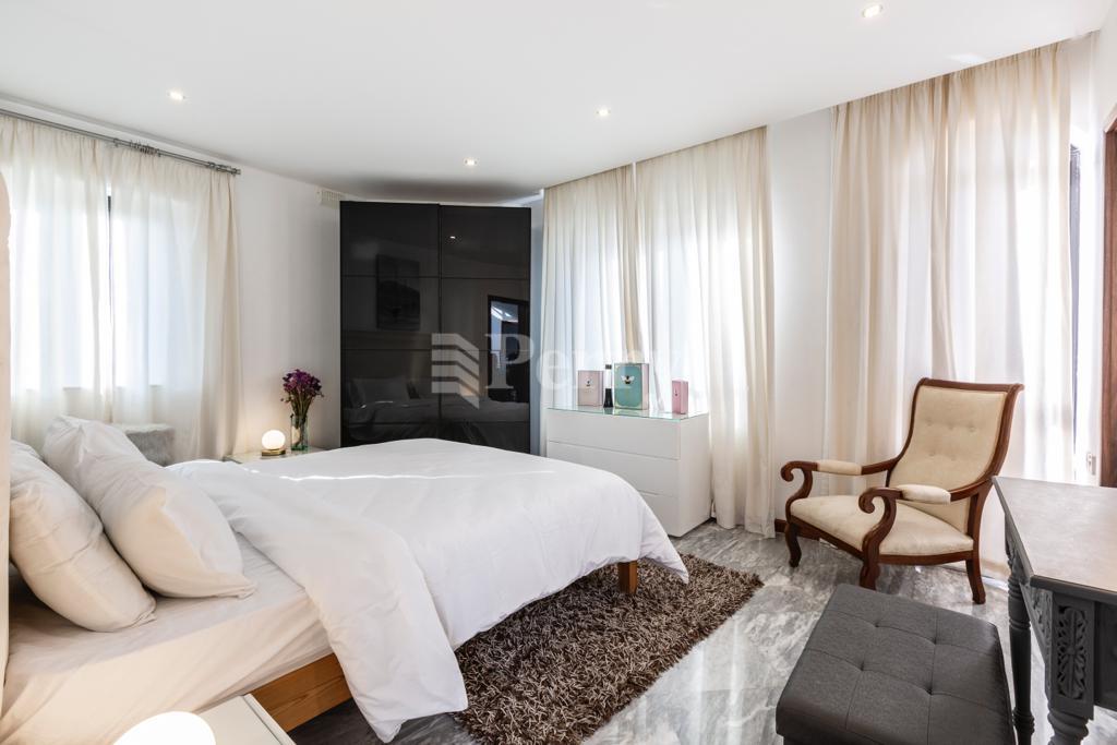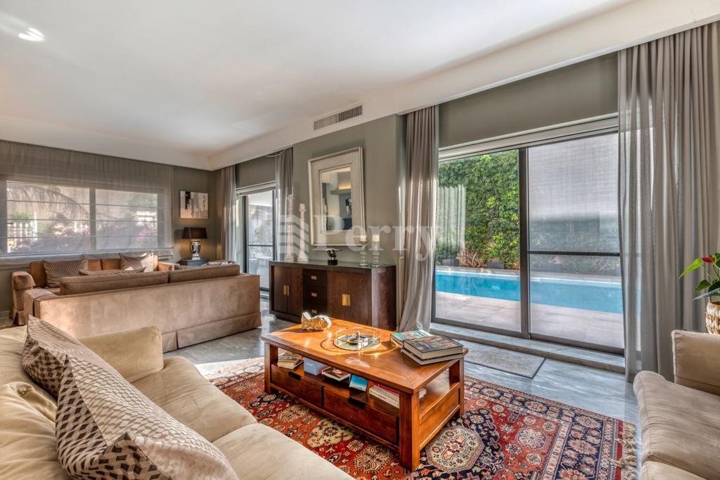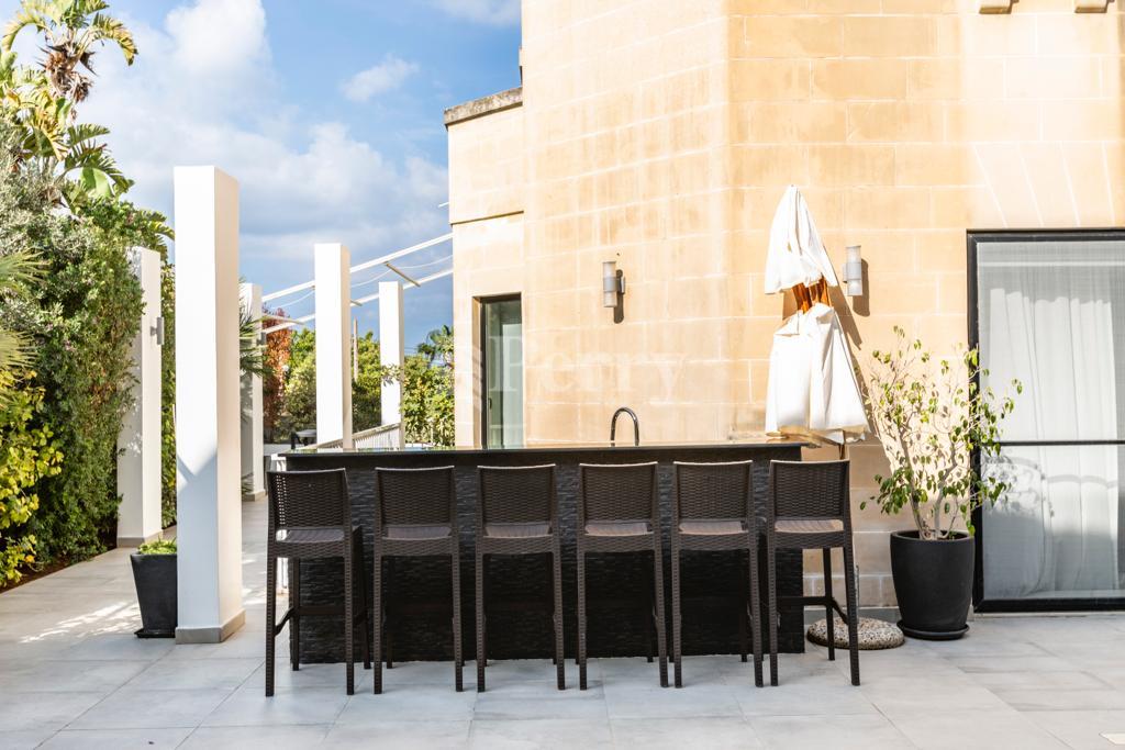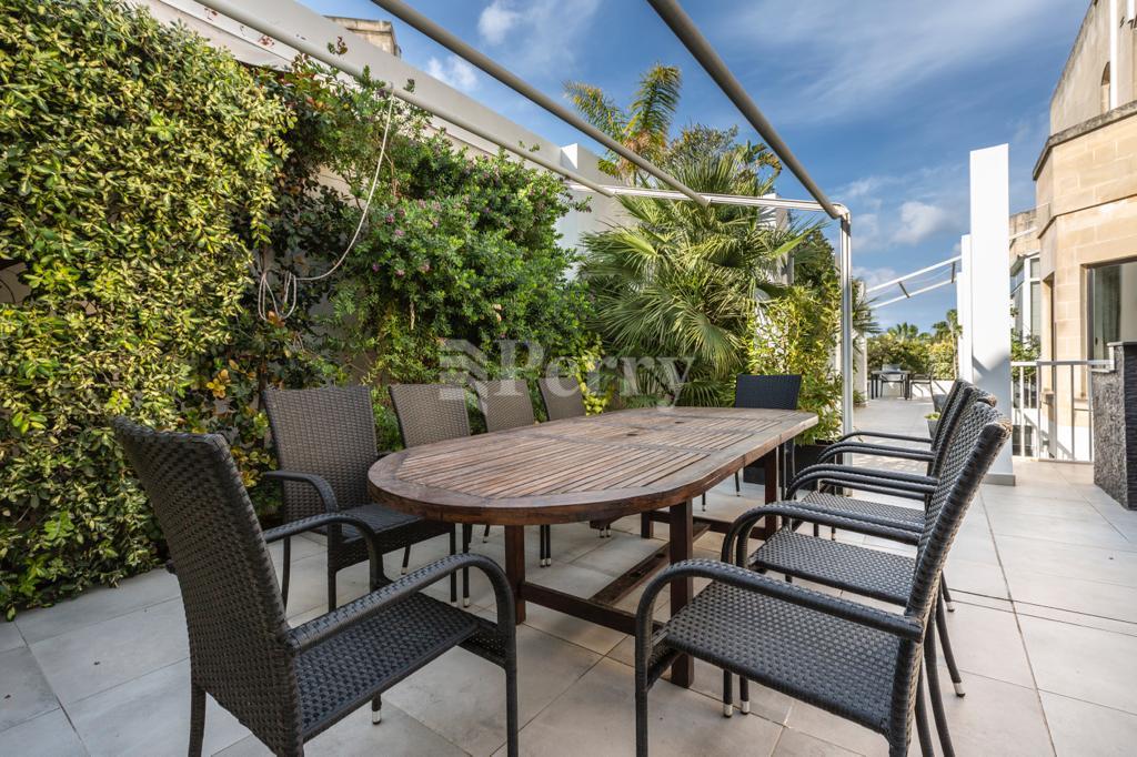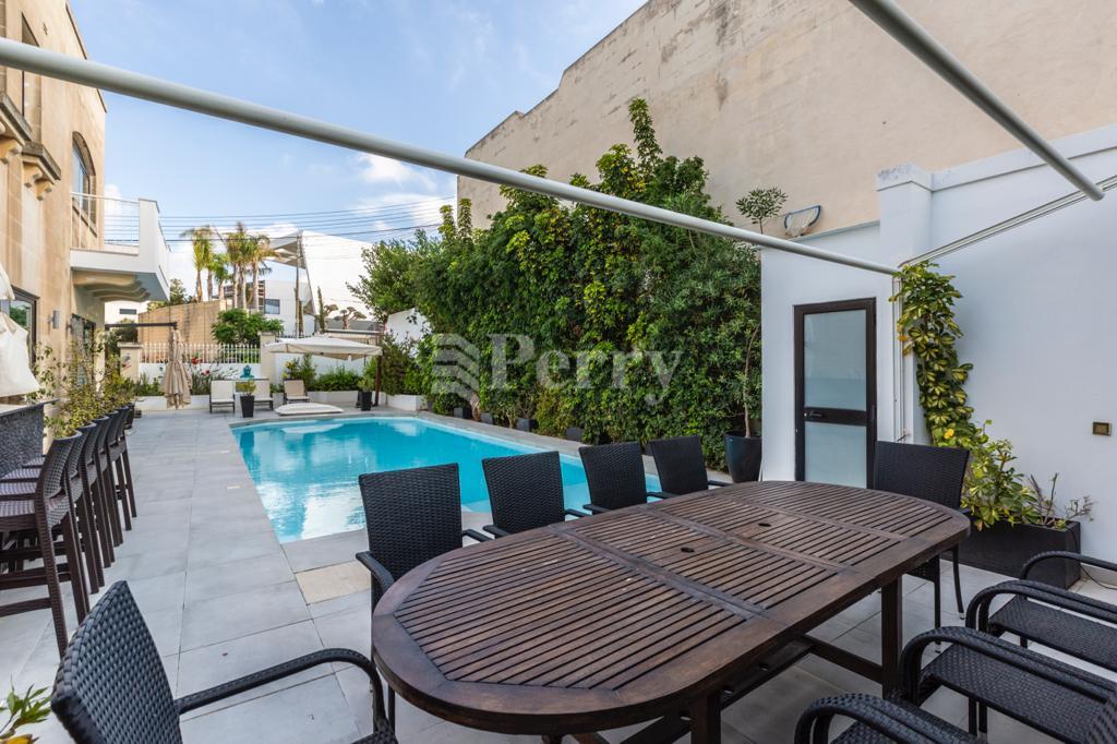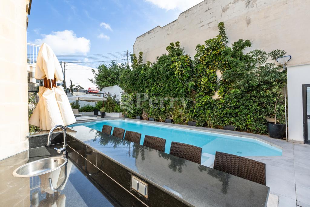HIGH RIDGE - MADLIENA. A luxury Semi Detached Villa in this superb location, an exclusive upmarket Villa area. Offered fully furnished and finished to the highest standard, the Villa is served by a lift. On the Ground Floor Level, it comprises a welcoming bright entrance hall with a lovely skylight feature, an open plan sitting / dining / living area, a separate dining room, a separate fully equipped kitchen with quality appliances, a study room and a guest toilet. There is ease of access from the entire ground floor area to the outdoor area, which incorporates a good sized swimming pool, extensive decking area, a landscaped surrounding garden, perfectly designed with a dedicated bar / seating / dining section for comfortable outdoor entertainment. On the first floor there are four double bedrooms, two bedrooms with bathrooms ensuite and a main bathroom. On the third floor there is a laundry room with access to a terrace, enjoying distant seaviews. At basement level there is a flatlet with an additional two bedrooms and a lock up garage for three cars. Special features include photovoltaic panels.